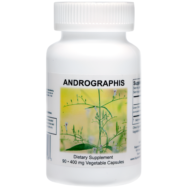 Andrographis is an herb indigenous to many asian countries, and it has a long history of being used for colds, sore throat, influenza, respiratory infections, sinusitis, UTI’s, diarrhea, etc. It has been shown to have broad spectrum antimicrobial properties as well as being anti-inflammatory and hepatoprotective. Studies have shown it to also have anti histamine properties and suppress IL-2. Among many things, andrographis has shown specific activity against Epstein Barr Virus (EBV) and help with gastro-enteritis. Some reports also show it to help with symptoms associated with low testosterone levels.