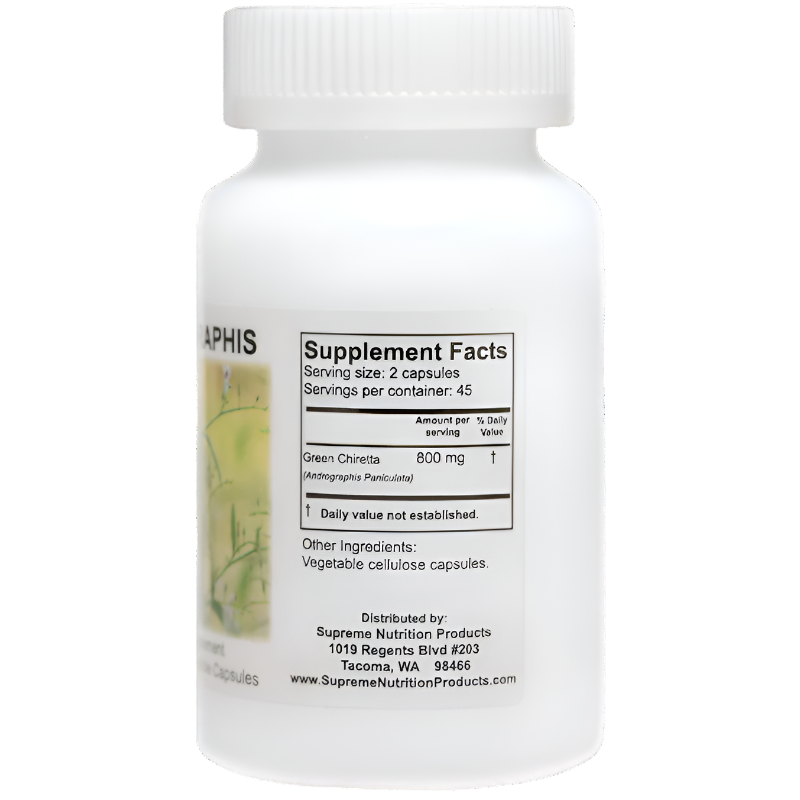 Andrographis is packaged in a bottle containing 90 veggie capsules, each containing approximately 400 mg of Andrographis paniculata (Green Chiretta) without fillers, binders, or excipients. Take 1-2 capsules 2x per day, or as directed by your healthcare professional.
