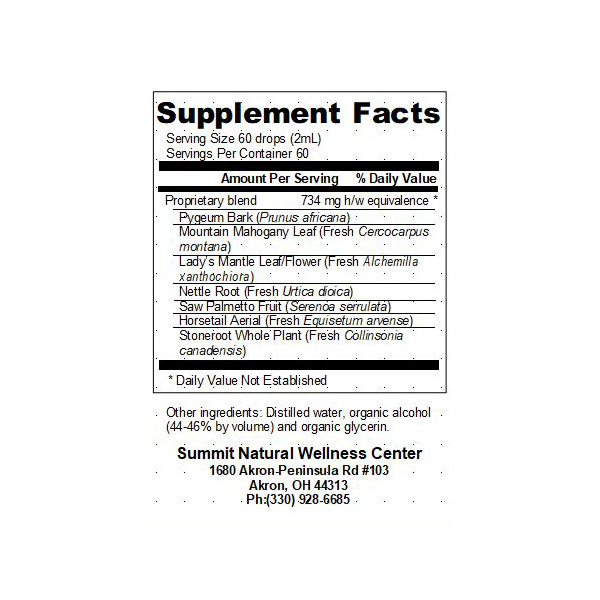 Cercocarpus montana leafy tips, Pygeum africanum bark, Alchemilla vulgaris leaf, Collinsonia canadensis whole plant, Equisetum arvense aerial, Serenoa serrulata fruit, Urtica dioica root (44–46% ethanol).