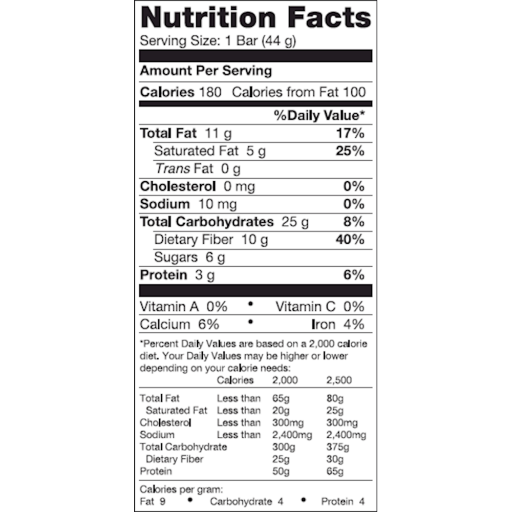 Other Ingredients: Dietary fiber syrup* (Isomalto-oligosaccharide [from cassava root*]), Coconut* tapioca syrup*, Almond butter* (dry roasted almonds*), Chia seeds*, Cassava root flour*, Cocoa Powder*, Natural flavor*, Semi-sweet chocolate coating* (unsweetened chocolate*, cane sugar*, Cocoa butter*)