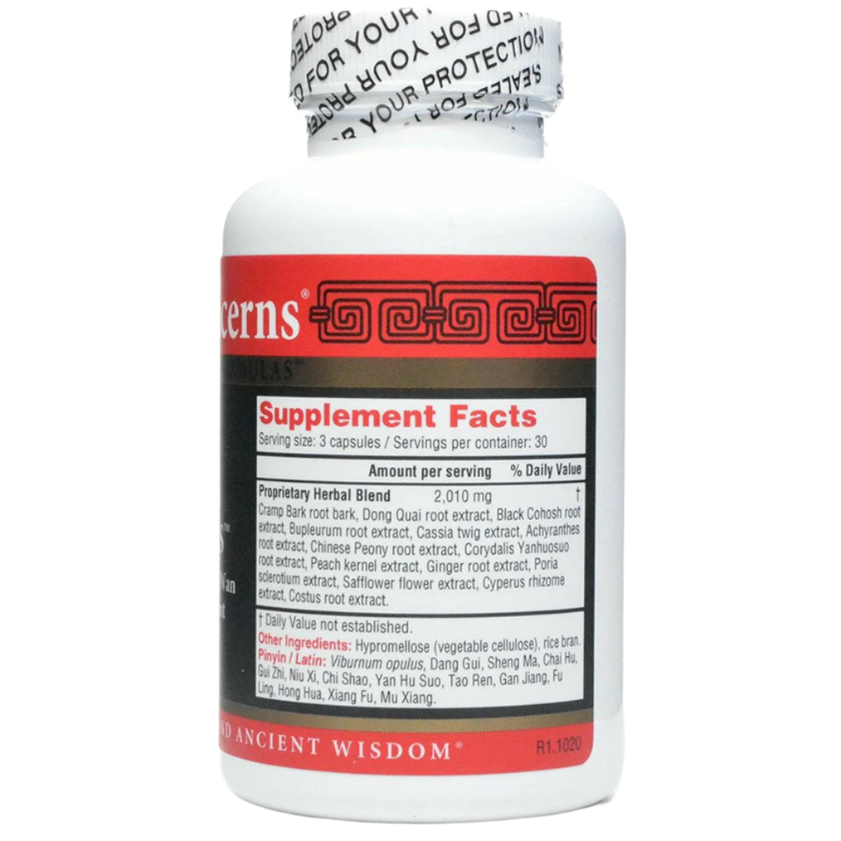Contains a blend of herbal extracts including Crampbark, Dong Quai, Black Cohosh, Bupleurum, Cassia Twig, and others
