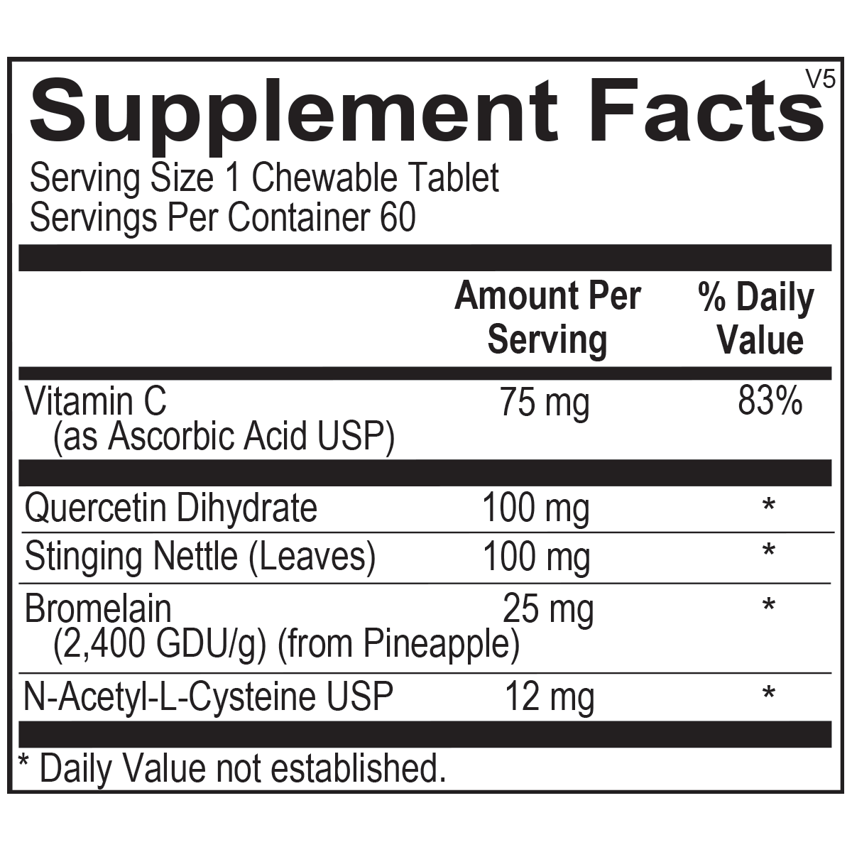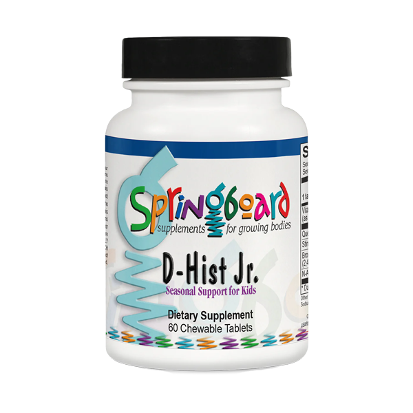 D-Hist Jr.™ is a great-tasting, chewable tablet that includes a targeted blend of flavonoids, antioxidants, proteolytic enzymes and botanicals designed to provide comprehensive support for children with seasonal challenges caused by common environmental allergens. D-Hist Jr.™ includes quercetin, a powerful flavonoid to support healthy histamine levels. It supplies bromelain to enhance the absorption of quercetin and to support mucosal tissue health and stinging nettles leaf to balance hyper-immune response. N-acetyl cysteine clears the airways by promoting normal viscosity of mucus. This unique nutritional combination safely promotes healthy nasal and sinus passages for children with elevated histamine and respiratory irritation.