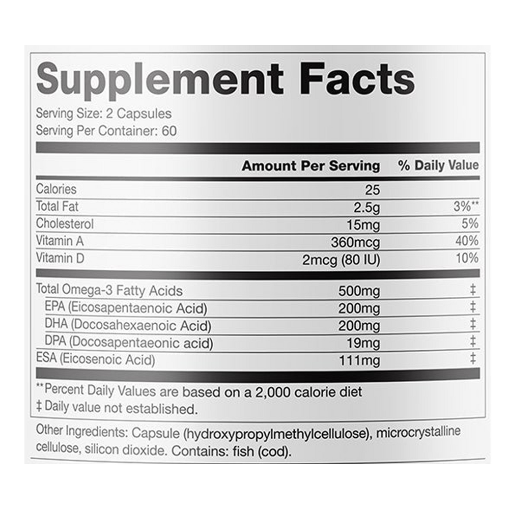 Refresh availabilityDutch Harbor Omega features omega-3 fatty acids sourced from Alaskan cod harvested in the waters of the Aleutian Islands. Each serving provides naturally occurring EPA, DHA, and DPA, along with vitamins A and D. The oil is encapsulated in softgels with natural lemon oil for a clean, neutral flavor.