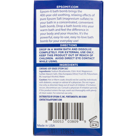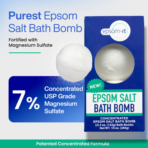 Refresh availabilityEpsom-It Bath Bombs provide a no-fuss, drop-and-soak solution to ease muscle discomfort. Packed with 7% concentrated Epsom salt, simply drop it in the bath, soak, and feel refreshed. Lightly scented, Epsom-It's concentrated Epsom Salt bath bomb is optimally formulated for post-workout use and general muscle discomfort. It's the "serious" bath bomb for your everyday muscle issues!