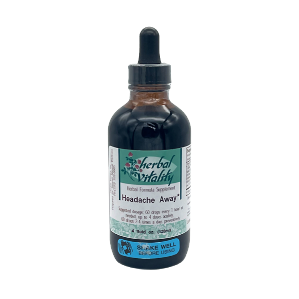 Refresh availabilityHeadache Away is a liquid herbal blend containing Tanacetum parthenium aerial parts, Chionanthus virginiana root bark, Lavandula officinalis flowers, Melissa officinalis leaves, Petasites palmatus aerial parts, Piscidia piscipula bark, Scutellaria lateriflora aerial parts, Stacey's veronica aerial parts, and Verbena hastata aerial parts.