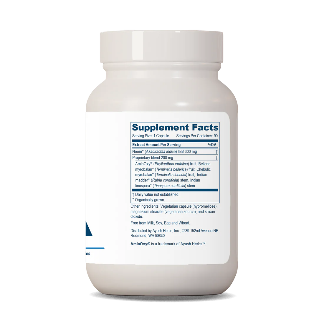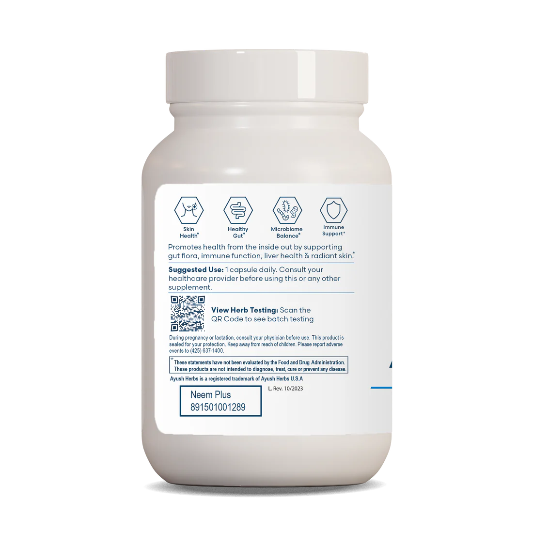 Refresh availabilityNeem Plus™ has Azadirachta indica (Neem) for its immune promoting properties. It also has, in a proprietary blend, Emblica officinalis (Amla), for its antioxidant and adaptogenic properties; Terminalia chebula (Haritaki), for its mild laxative, for occasional constipation, and digestive aid properties*; Terminalia belerica, for its digestive and liver support*; and Tinospora cordifolia and Rubia cordifolia for their immuno-supportive effects*. Neem Plus™ helps support the immune system and is useful in promoting healthy skin.*