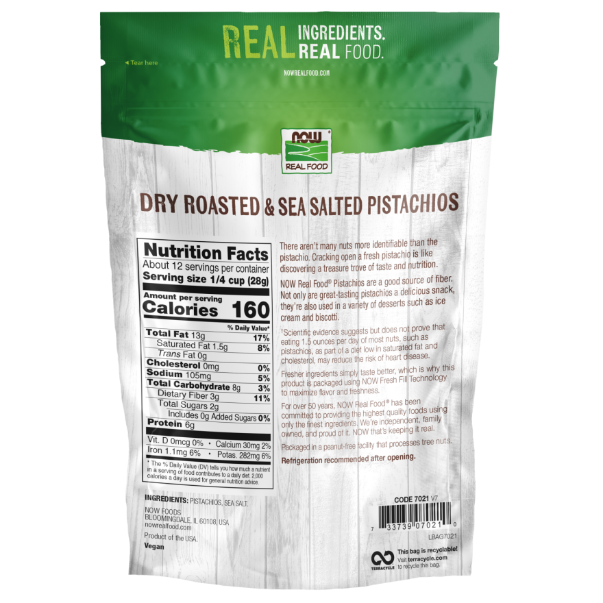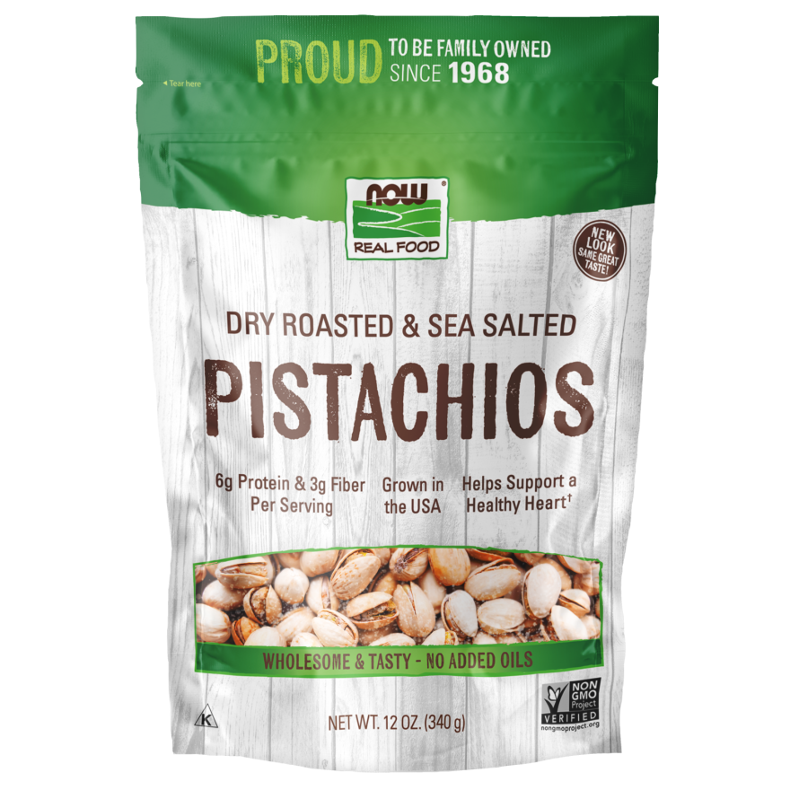 NOW Real Food® Pistachios are a good source of fiber. Not only are great-tasting pistachios a delicious snack, they’re also used in a variety of desserts such as ice cream and biscotti.