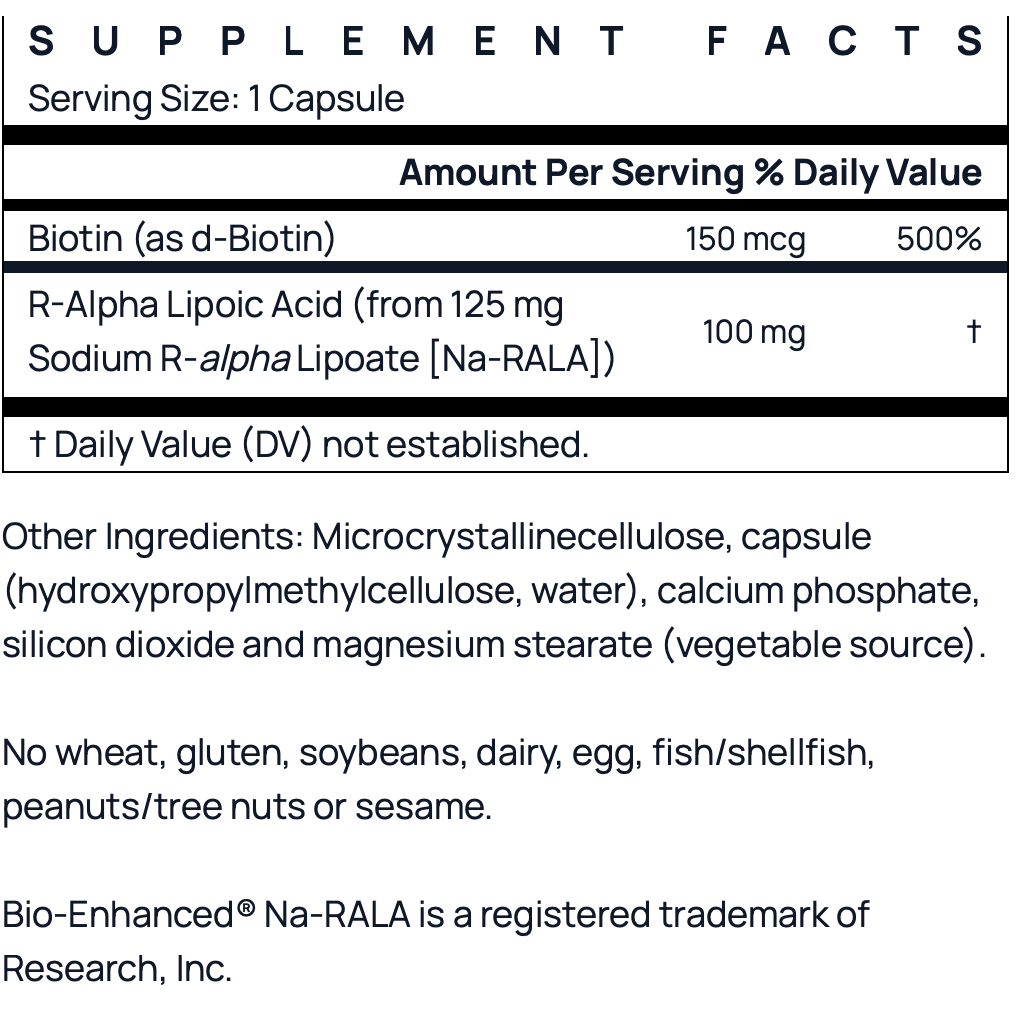 Contains stabilized R-(+)-Alpha Lipoic Acid (Bio-Enhanced® Na-RALA)