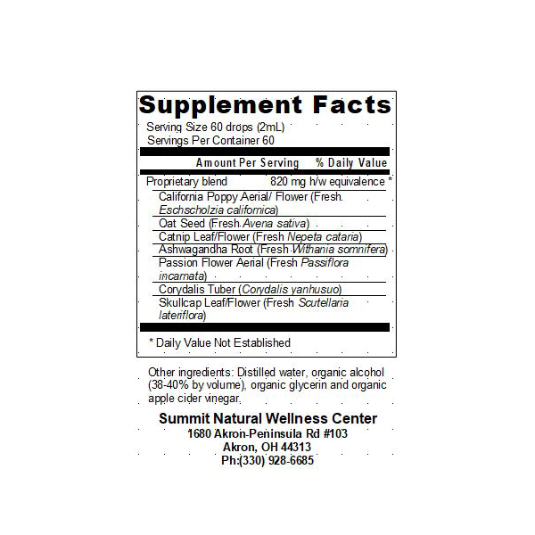 Refresh availabilityEschscholzia californica aerial and flower, Avena sativa milky seed, Withania somnifera root, Nepeta cataria leaf, Passiflora incarnata aerial, Corydalis yanhusuo tuber. (38-40% ethanol)