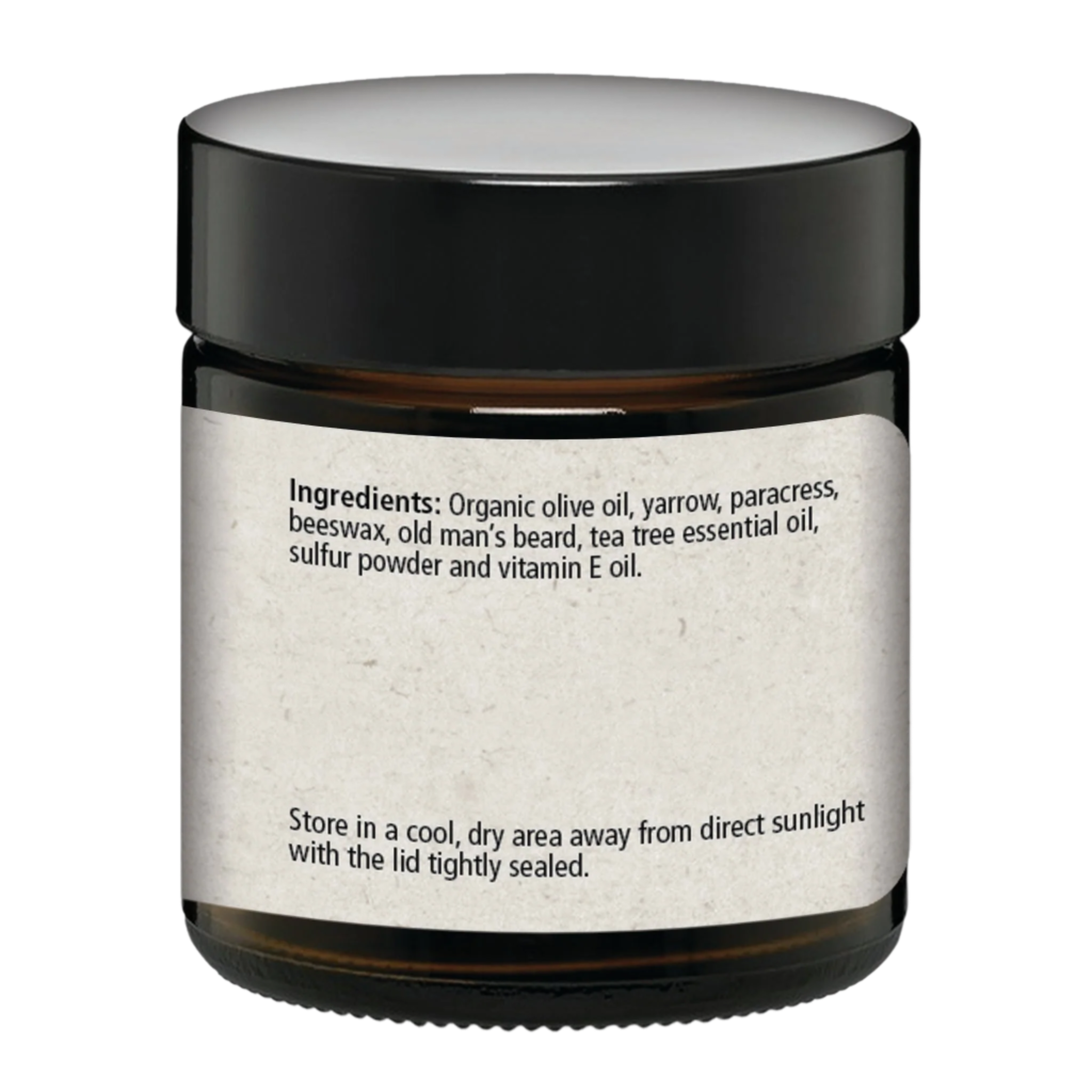 Olive oil, beeswax, tea tree essential oil, sulfer powder, yarrow, black walnut, old mans beard, para cress and vitamin E (d-alpha-tocopherol acetate)(soy based).