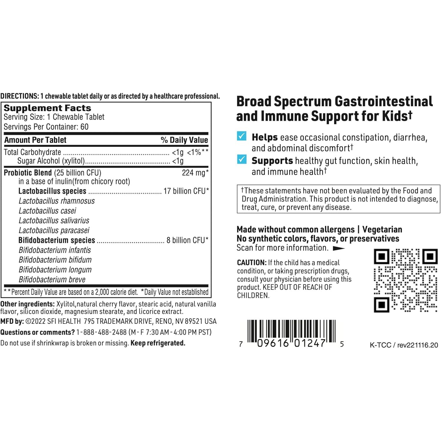 Refresh availabilityTher-Biotic Kid’s is a chewable probiotic supplement formulated for children ages 2 and up. It provides a blend of 8 Lactobacillus and Bifidobacterium species in a natural cherry-flavored tablet. Each serving supplies 25 billion CFU in a base of inulin, designed to complement a child’s daily wellness routine.