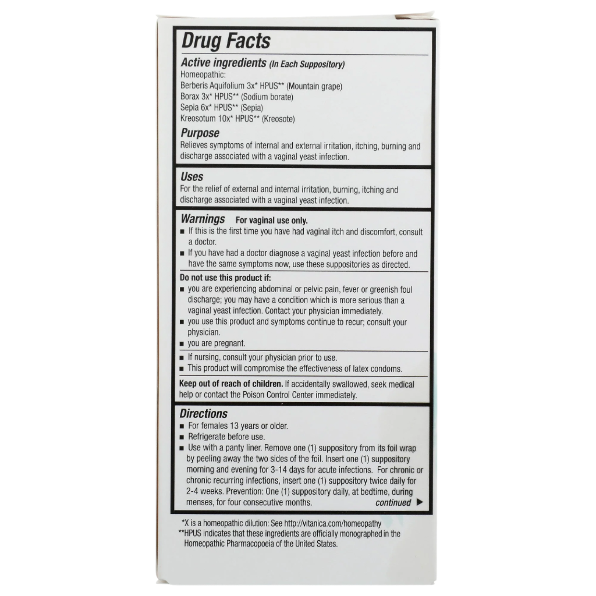 Remove one (1) suppository from the foil wrap and insert into the vagina. Insert one (1) suppository morning and evening for 3-14 days for acute infections, insert one (1) suppository twice daily for 2-4 weeks, or as recommended by your healthcare professional.