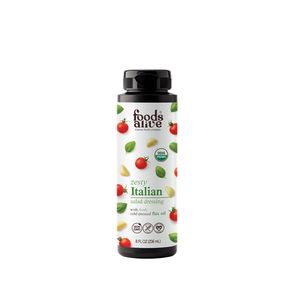 Other Ingredients: Unrefined gold flax oil*, filtered water, rice vinegar*, unrefined chia oil*, garlic granules*, Himalayan pink salt, onion powder*, Italian herb blend* (parsley*, basil*, marjoram*, oregano*, rosemary*, thyme*, sage*), coconut sugar*, tomato powder*.